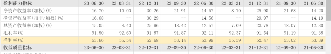 事实上,相较于2022年同期,2023年上半年茅台的营业利润率稍有下滑。2022年同期茅台毛利率为92.11%,净利率为53.99%,今年上半年的毛利率为91.80%,同比下滑0.31个百分点,净利率为53.66%,同样下滑了0.33个百分点,尽管毛利率和净利率下滑幅度都不大,但对于茅台这样体量的企业来说,毛利率和净利率每下滑0.1个百分点,都是不小的金额。