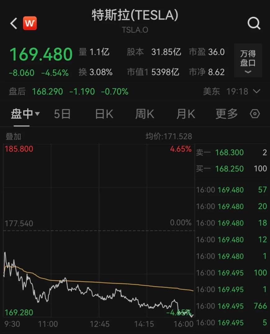 周三,美国三大股指收盘涨跌不一,科技股多数下跌,其中特斯拉跌4.54%,市值一夜蒸发255亿美元(约合人民币1835亿元)。