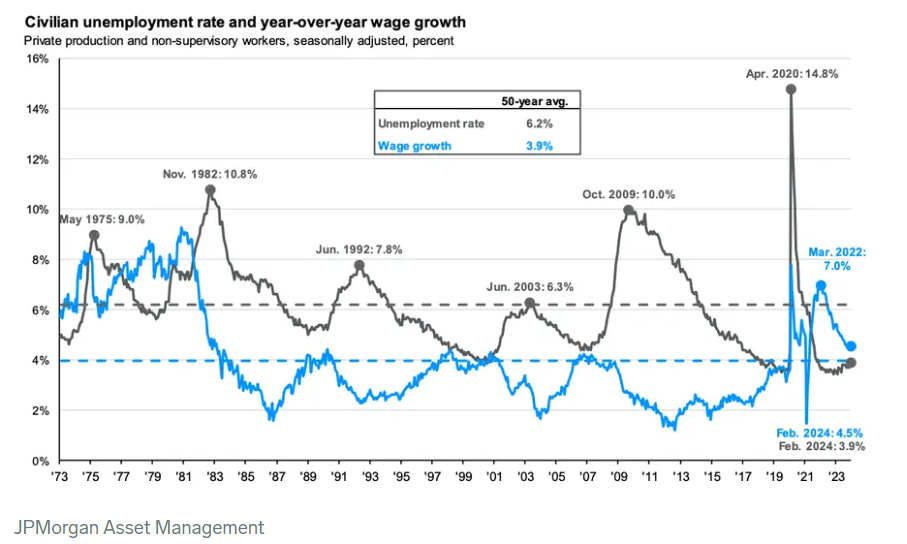 尽管总体上想要工作的美国人大多找到了工作,而且移民涌入也使得失业率维持低位,形成了相对紧张的劳动力市场。然而,美国工资增长率在2月份仅为4.5%,虽高于通胀率,但在经历了1980年代以来最大的物价上涨潮后,这一数字并没有显著超出50年平均水平,这让凯利感到困惑。