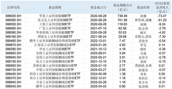 Wind数据显示,目前跟踪科创50指数的公募基金共有36只,其中场内ETF有18只,场外ETF联接基金及指数基金有18只,截至9月12日收盘合计规模为2123.29亿元。其中,华夏上证科创板50ETF(588000.SH)、易方达上证科创板50ETF(588080.SH)最新规模均超过了700亿元,位居同类产品的首位。