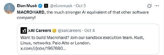 就在本月初,他转发了MACROHARD的招聘信息并调侃道:“MACROHARD,一个比那家软件公司强大得多的人工智能同类产物!”