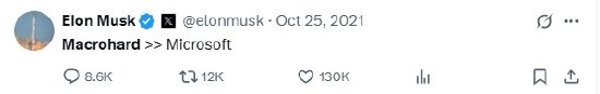 而早在2021年,他发文调侃“Macrohard>>Microsoft(微软)”。据报道,马斯克与微软创始人比尔·盖茨不和,“巨硬”则是对标微软公司名称。