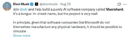 他进一步解释称:“xAI的MACROHARD项目将在巨大规模上产生深远影响。我们的目标是创建一家除了不直接制造物理物体之外,能够做任何事情的公司,不过它将能够间接做到这一点,就像苹果让其他公司制造他们的手机一样。”