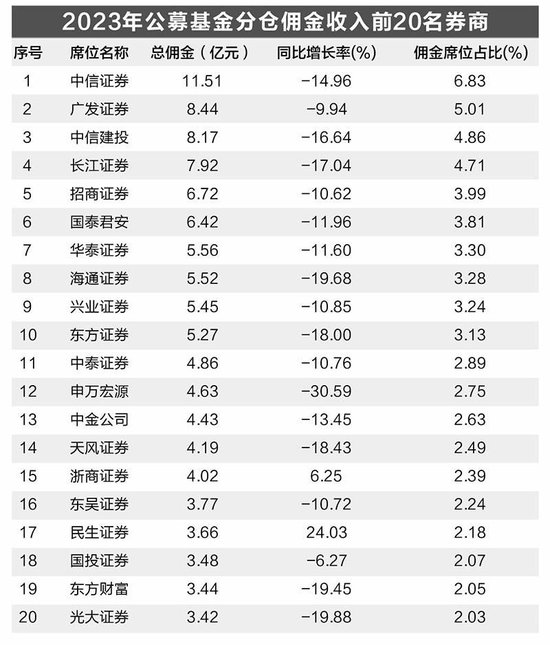 以2023年分仓佣金收入数据来看,全年规模约168.36亿元,同比下降10.92%。马太(金麒麟分析师)效应依然明显,前5名券商席位占比高达25.4%,前10名券商席位则分走市场4成左右蛋糕。但也出现了一些新的变化,在2023年公募基金分仓佣金收入排名前40的券商中,民生证券、国海证券、德邦证券、财通证券和国联证券均实现超20%以上的增长。相对应的,粤开证券、东兴证券、西部证券等则有所下滑。