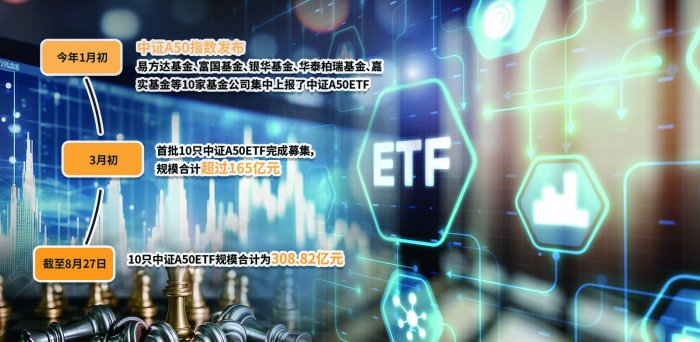 从发行情况来看,首批中证A50ETF募集规模合计超过165亿元,其中多只ETF募集规模达到上限20亿元。从最新规模情况看,据Choice测算,截至8月27日,10只中证A50ETF规模合计为308.82亿元。