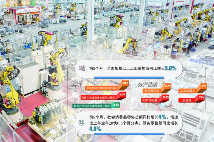 前2个月,全国规模以上工业增加值同比增长5.9%,虽然比2024年12月增速有所回落,但比2024年全年增速加快0.1个百分点。