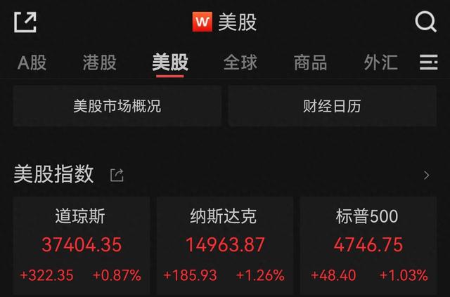 美东时间周四,美股三大指数集体收涨。道指涨322.35点,涨幅为0.87%,报37404.35点;纳指涨185.93点,涨幅为1.26%,报14963.87点;标普500指数涨48.40点,涨幅为1.03%,报4746.75点。