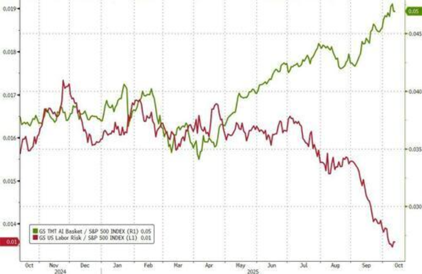 高盛的最新研究进一步印证了这一矛盾。该行指出,美国股市的两个主要主题基本保持不变:人工智能的持续发展推动AI股票篮子(GSTMTAIP)表现优异,而对劳动力市场的持续担忧则反映在劳动力敏感篮子(GSXULABR)的表现不佳上。