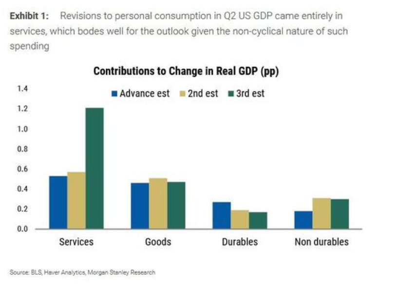 据摩根士丹利数据,经济增长最终取决于支出,而最新的支出数据显示经济稳健甚至强劲。尽管二季度GDP数据相对陈旧,但显示家庭服务支出有所回升,根据现有数据,三季度消费支出增长接近3%。